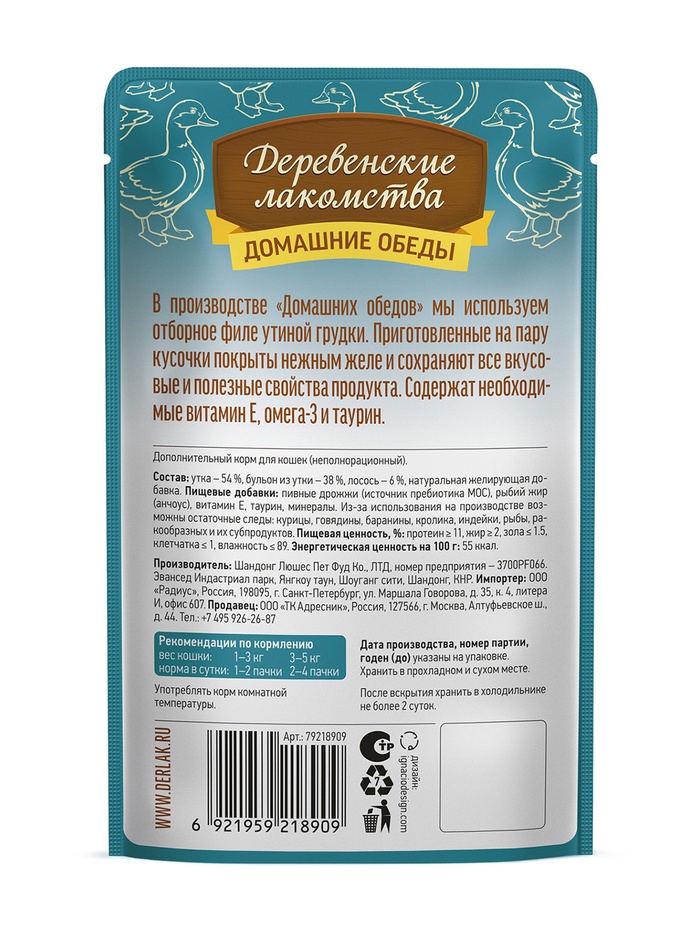 Консервированный влажный корм для кошек серии «Деревенские лакомства — Домашние обеды» из нежного мяса лосося и отборного утиного филе — гармоничное сочетание для пушистых любителей изысканных блюд, созданное специально для питомцев, ценящих гастрономическое разнообразие.