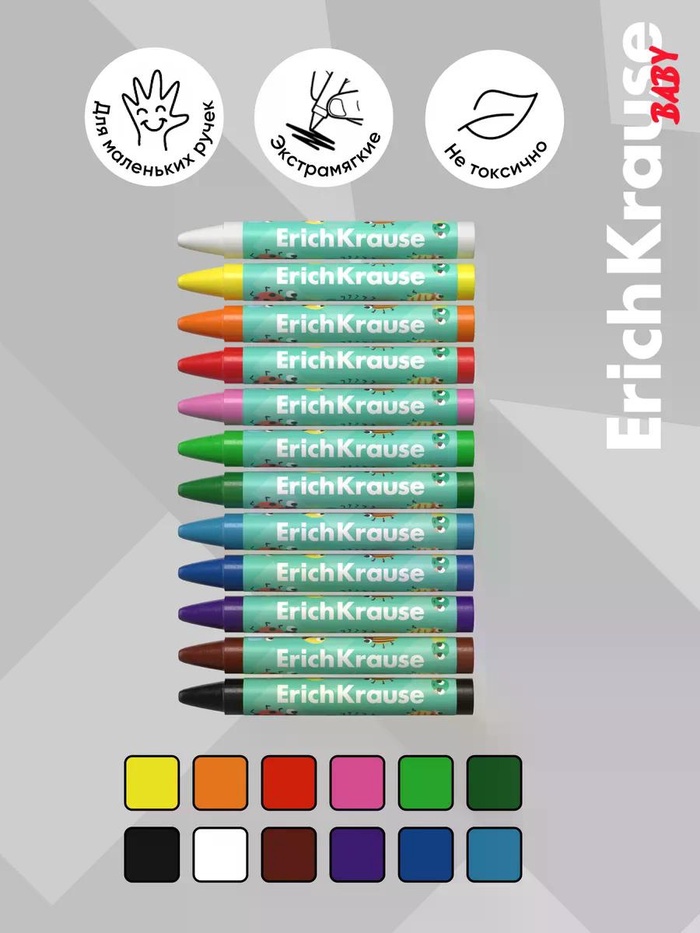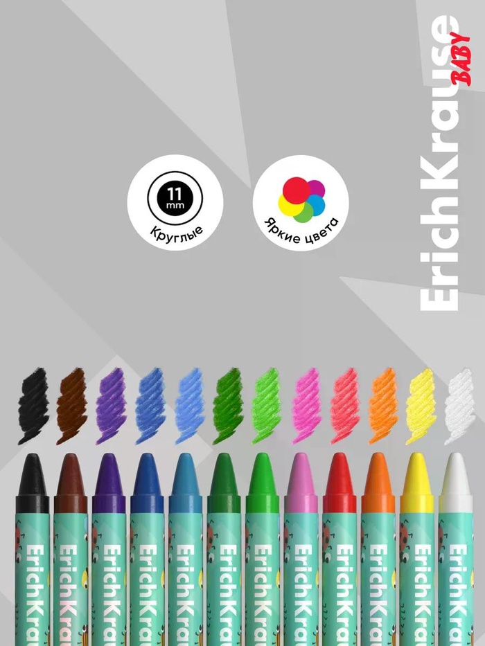 Восковые мелки Baby Jumbo с натуральным пчелиным воском в составе. В наборе 12 классических цветов. Диаметр корпуса 25 мм, поэтому мелок удобно держать самыми маленькими ручками. Мелки рисуют мягко и ярко без необходимости сильного нажима. Благодаря индивидуальной бумажной обертке на каждом мелке руки ребенка остаются чистыми.