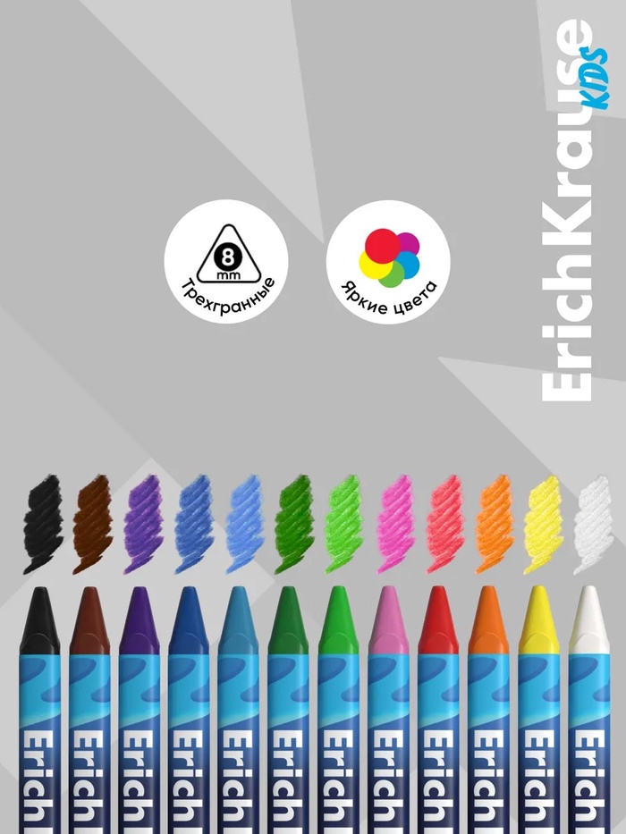 Экстрамягкие восковые мелки для детей. Корпус трехгранный диаметром 8 мм, предварительно заточен, обернут в бумагу, устойчив к поломкам. Подходят для рисования на разных поверхностях, прекрасно ложатся на бумагу, картон и дерево. Рисунки со временем не теряют яркости.