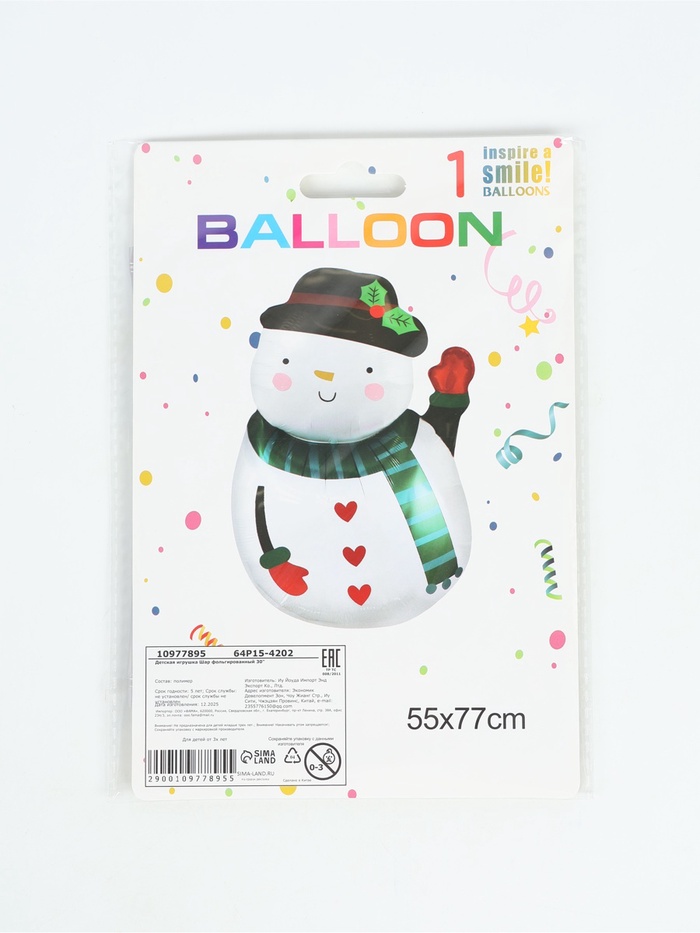 Воздушный шар фольгированный 30" "Снеговик в шляпе" инд. уп.