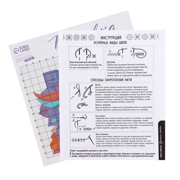 - В инструкции подробно описаны стежки и варианты закрепления нити, которые можно использовать во время творческого процесса.