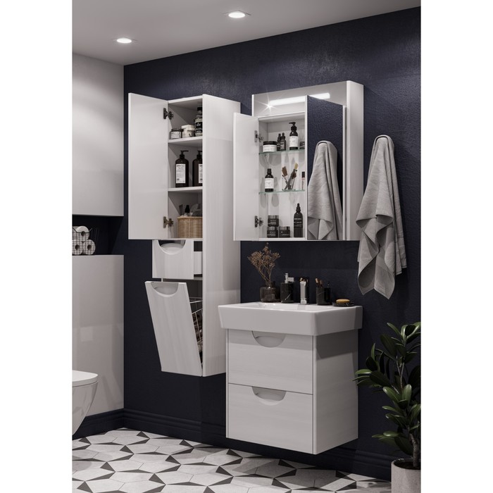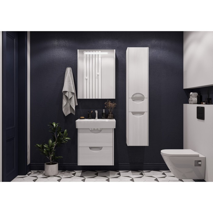 Боковые стенки шкафа изготовлены из МДФ, покрытой плёнкой цвета «дуб полярный», корпус — из влагостойкой ЛДСП. Фасад состоит из 2 распашных створок и верхнего зеркала со встроенным светодиодным светильником. За дверцами установлены 2 регулируемые по высоте стеклянные полки.