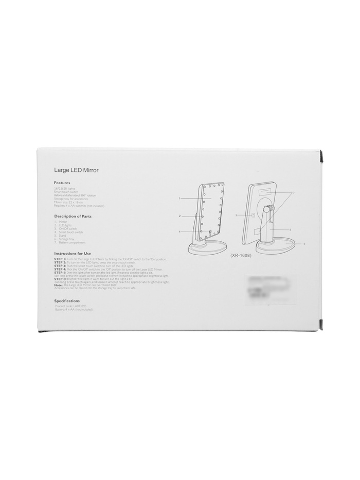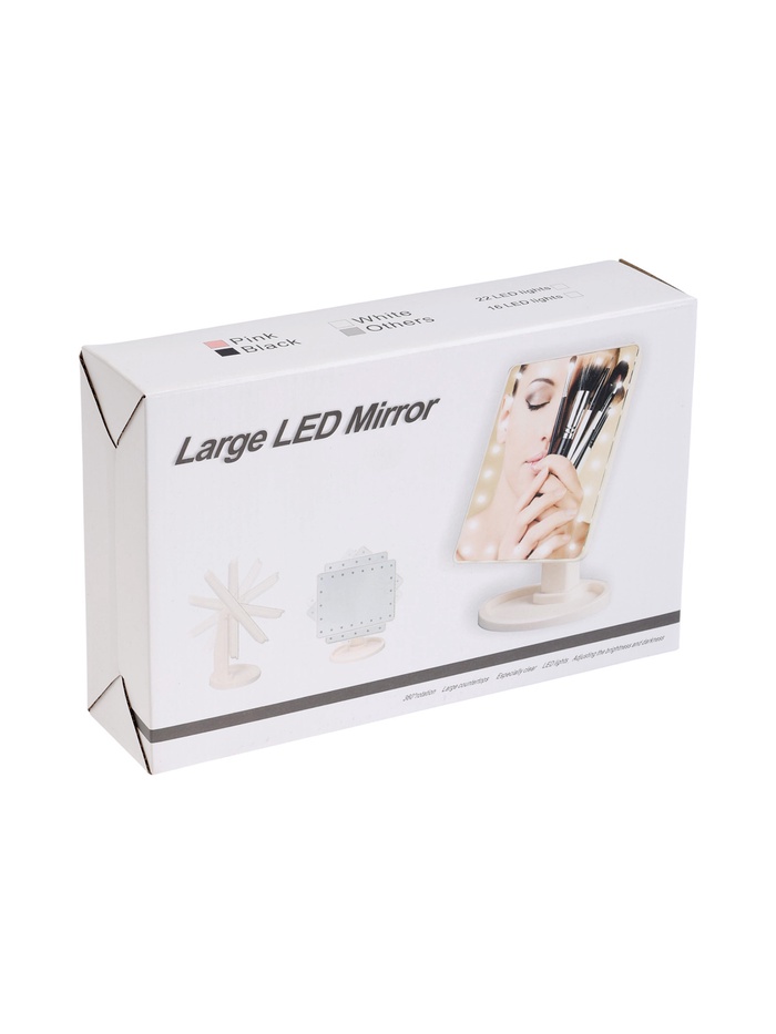 Зеркало с подсветкой KZ-06 размером 26.5 × 16 × 12 см оснащено 22 светодиодами и сенсорной кнопкой для удобного включения подсветки. Работает от 4 батареек AA, корпус выполнен из пластика, зеркало — стеклянное.