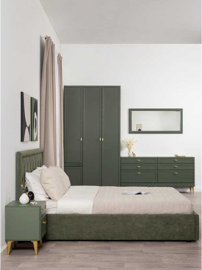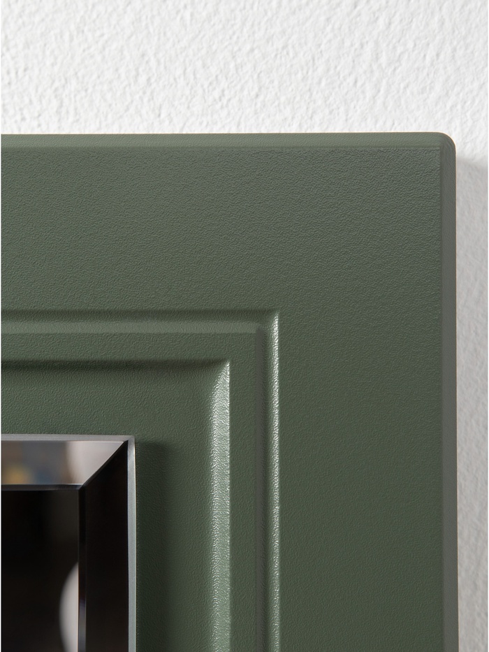 Рама с изящной фрезеровкой подчёркивает классический стиль, а благородный оттенок «Олива шагрень» с глубоким зелёным тоном создаёт уютную и гармоничную атмосферу.