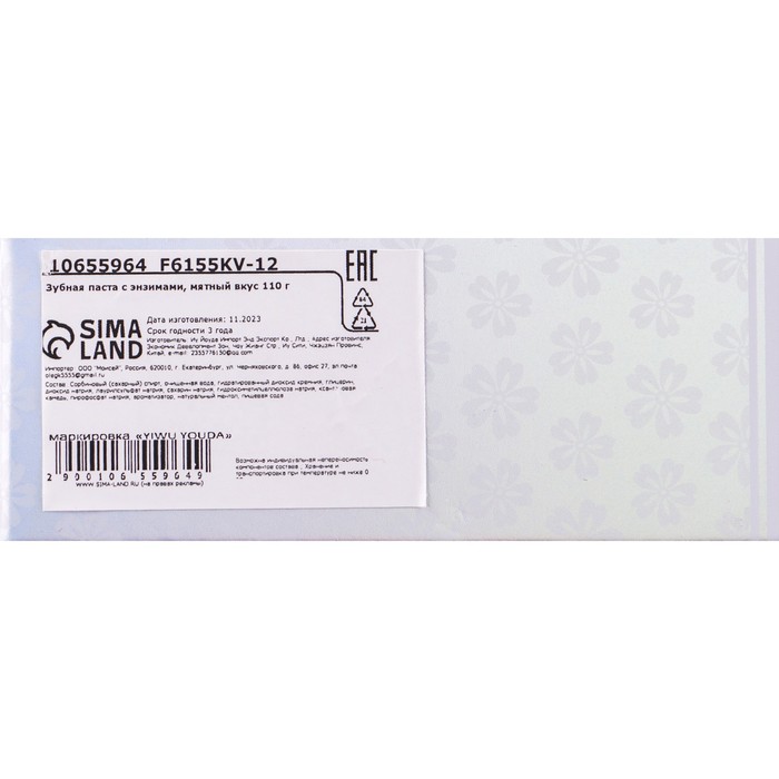 Технические характеристики Зубная паста с энзимами, мятный вкус, 110 г