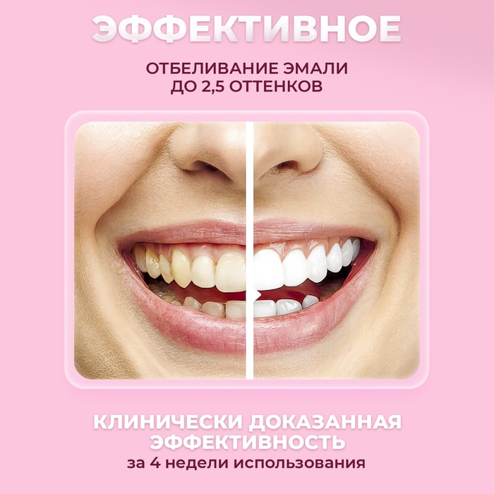 Содержит микрогранулы с пероксидом карбамида и фермент бромелайн для расщепления мягкого окрашенного налета и отбеливания эмали на 2 оттенка за 4 недели применения.