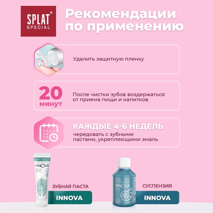 Рекомендуется людям старше 18 лет. Чередуйте с укрепляющей пастой (SPLAT Professional BIOCALCIUM, SPLAT Special ORGANIC), чтобы избежать повышения чувствительности зубов.